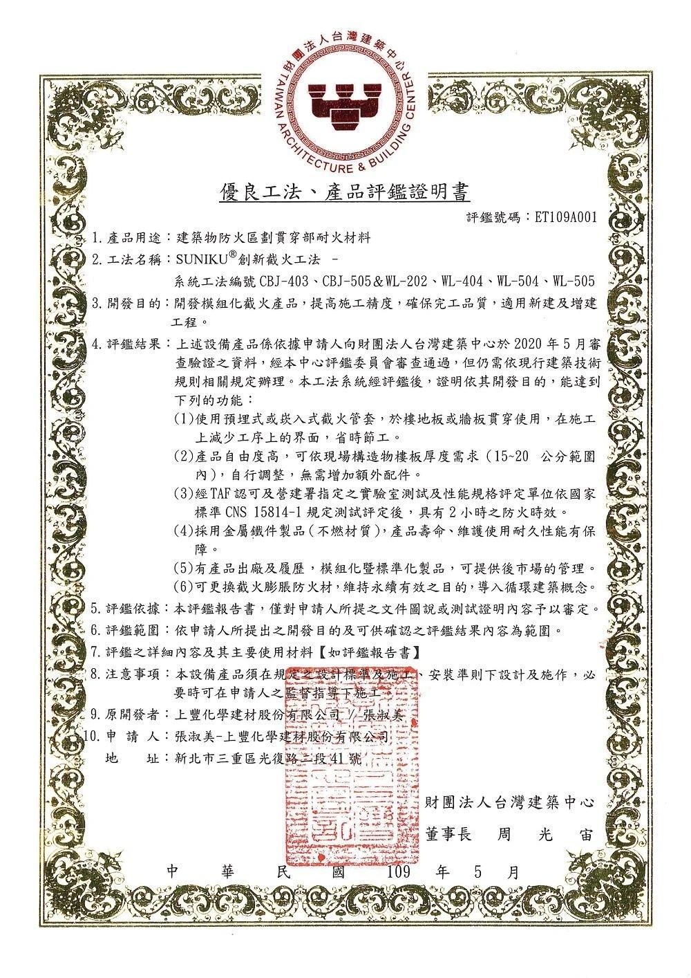 SUNIKU創新截火工法,針對建築物防火區劃貫穿部耐火材料, 榮獲台灣建築中心評鑑為優良工法,透過模組化的截火產品,可以提高施工精度,確保完工品質,適用新建及增建工程。